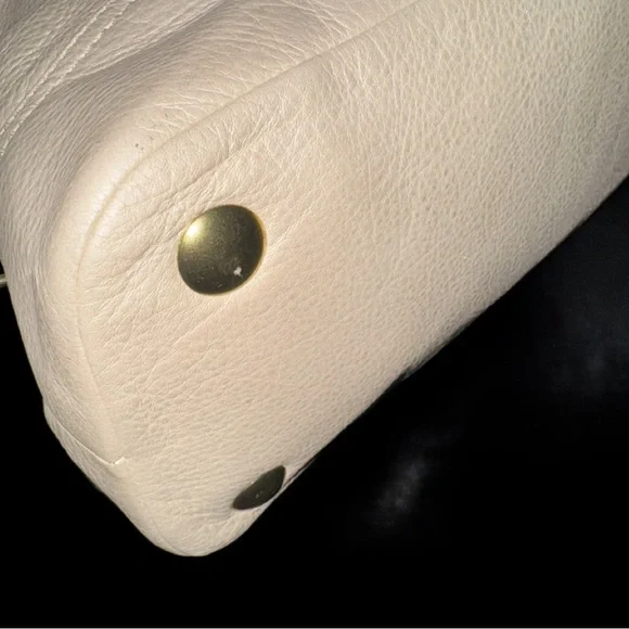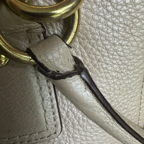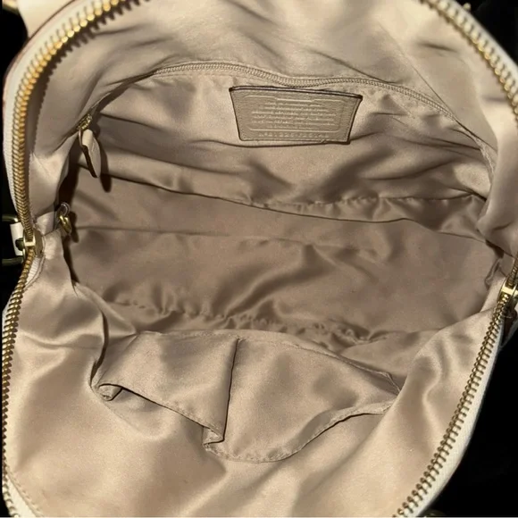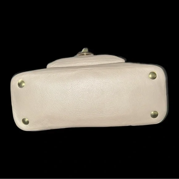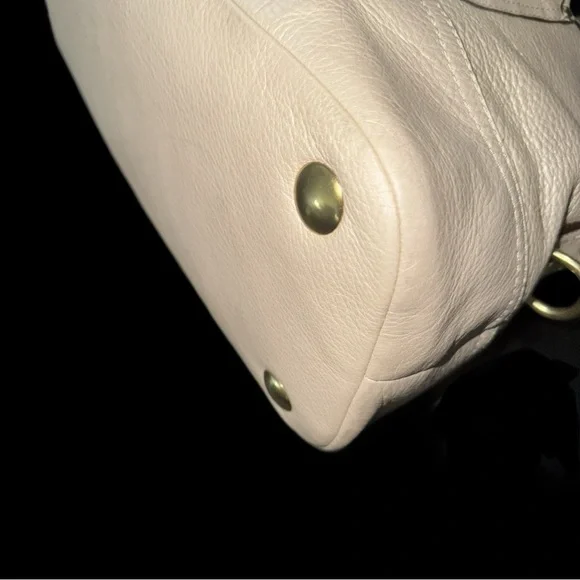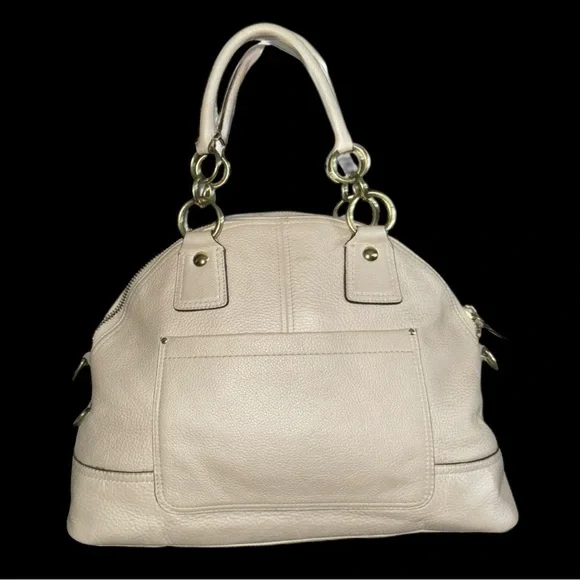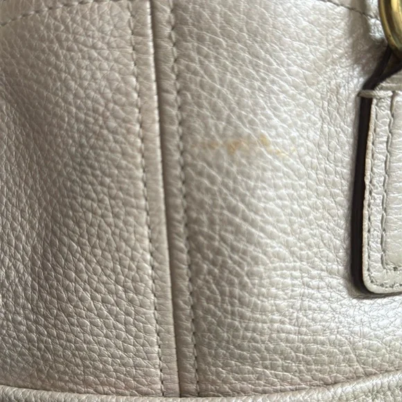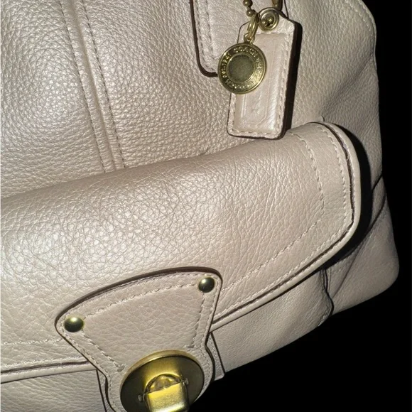 This elegant cream leather Coach handbag is perfect for any occasion. Its sophisticated design and high-quality material make it a must-have accessory.Coach Legacy Francine Leather Handbag - EUC with just a minor spot on back between handles and stitch missing from on part of a handle (shown in last 2 pics).